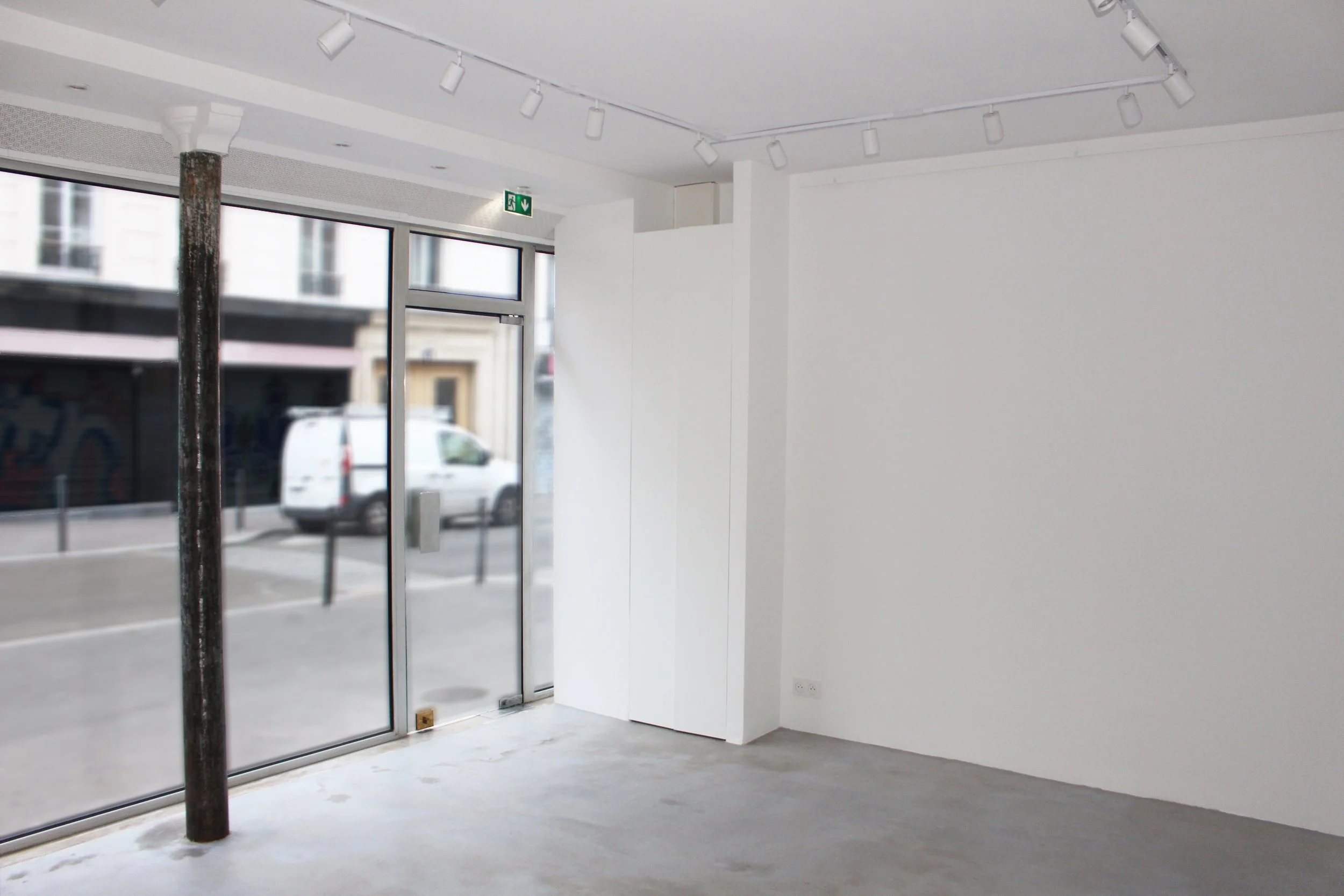 Intérieur de l'ESPACE SAMBRÉ avec murs blancs, sol en béton, grande vitrine en verre avec vue sur la rue Sambre-et Meuse, colonne en métal.