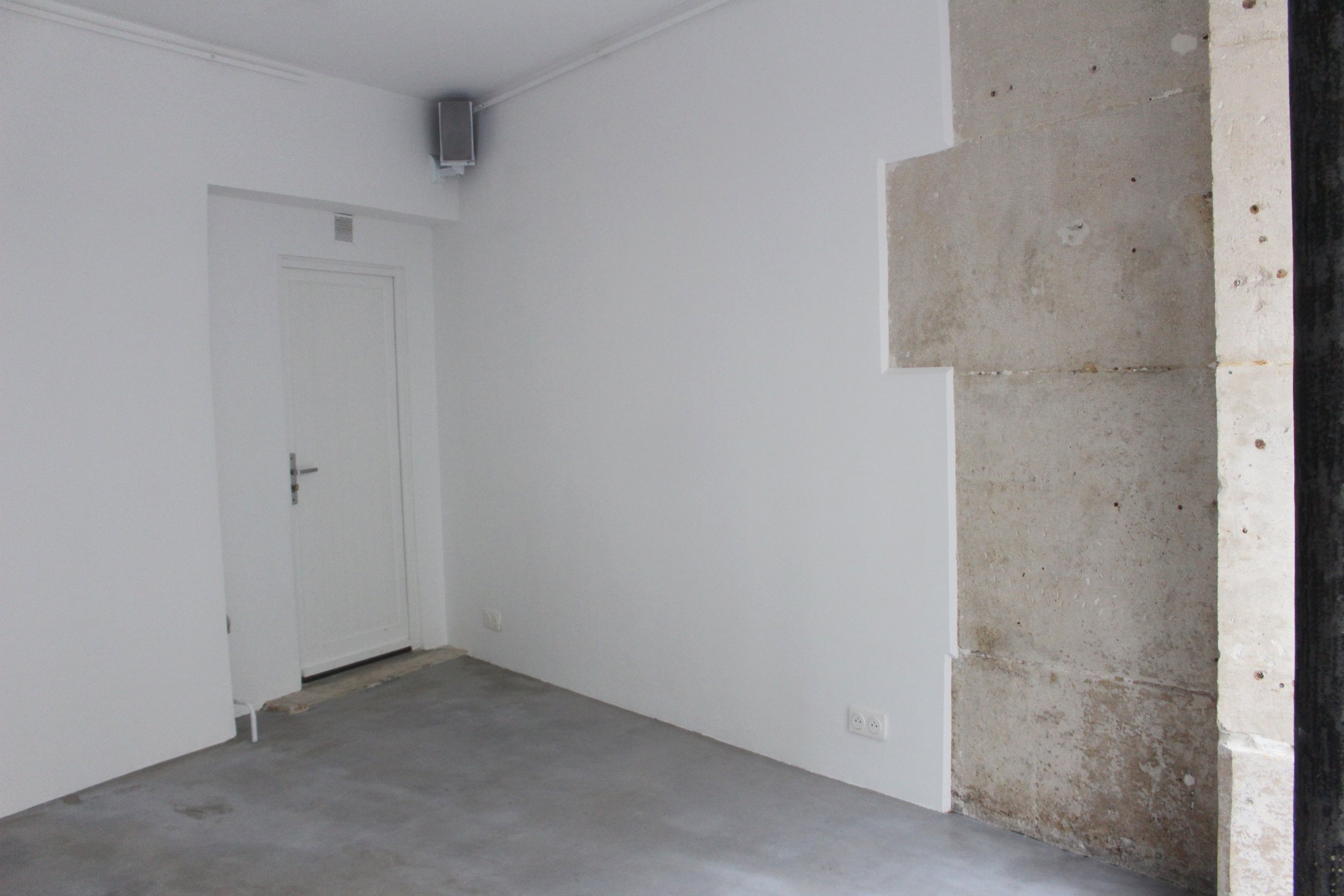 Intérieur de l'ESPACE SAMBRÉ avec murs blancs, sol en béton, porte blanche, et mur partiellement en pierre de taille.